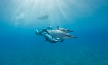 Hawaiian spinner dolphins, named for their acrobatic displays like leaping out of the water and spinning in the air, are nocturnal. To make it harder for sharks to detect them, they hunt for food and socialize at night. During the day, they rest in sheltered coves—safe from sharks and other ocean