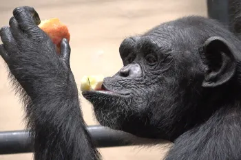 Chloe is the youngest chimp in her social group but is wise beyond her years in fashion. After seeing us approach her enclosure, she wrapped herself in a blue shawl and made sure all of us could see her outfit. We all agreed that blue really is her color.