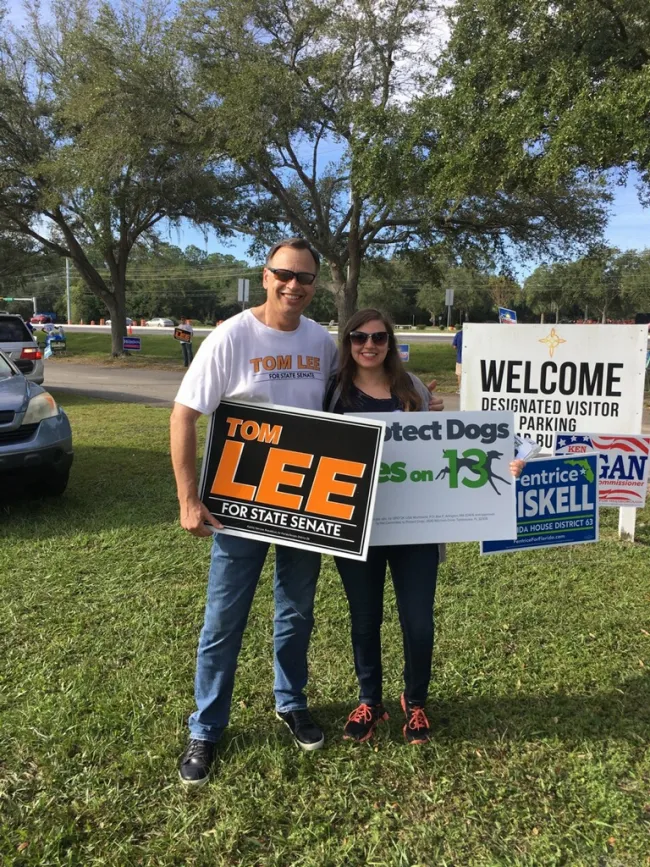 Florida State Sen. Tom Lee, who originally introduced the greyhound ban measure before the Florida Constitution Revision Commission, with HSUS Grassroots Outreach Manager Emily Spivak at a polling place.[/caption]