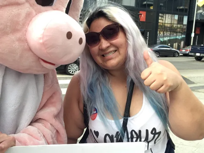 Josh has spent the last few days standing at street corners in a pig suit, raising awareness about the measure. A vast coalition of partners did the work to get Prop 12 to the ballot, collecting 660,000 signatures and setting the stage for this momentous vote that would create a precedent for how billions of farm animals are treated globally.