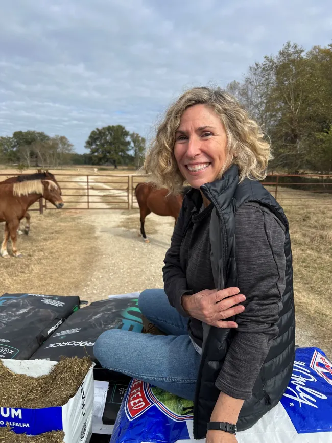 This week, I had the pleasure of working with the sanctuary’s equine team. We set out bright and early at 7 a.m. to feed and medicate hundreds of horses and donkeys. Without halters or leads, horses and donkeys in multiple paddocks were led into their respective feeding enclosures. Some of the horses and donkeys are leery of people because of the abuse they’ve suffered in the past and wouldn’t approach food until we backed away; others came galloping up as enthusiastically as puppies.
