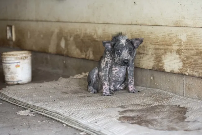 Pepper was living in a dark, open garage with two other dogs on a property in Kansas when we found her. She had lost all her fur because of a chronic skin condition and was huddled in a corner, almost motionless, when Adam Parascandola, senior director for animal protection and crisis response, found her. But as we experience time and again, animals – even those coming from situations of horrible neglect or mistreatment -- show a remarkable resilience and ability to heal. For Pepper and 30 other animals rescued that day, the road to recovery began immediately. That afternoon, when Adam visited Pepper in a holding area, she was already feeling better and even eager for attention and a walk.