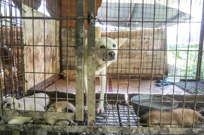 Then there’s Storm, a survivor of a dog meat farm our HSI Animal Rescue Team closed down this year in Korea. Storm, a beautiful white Jindo with five healthy, big puppies living in a cage with her, was dangerously thin, her ribs protruding, and she had an open wound on her lower front leg. The wound was so badly infected after having been neglected for so long that her veterinarian was afraid she might lose the leg. But thanks to extensive veterinary care and the love and dedication of her new family, who asked to bring Storm (now renamed Skye) home right away to give her a place to heal, her leg was saved and she is well on her way to recovery.