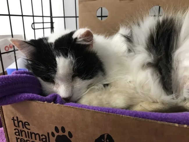 Jonas was also filthy and matted with feces on his fur when we came upon him at the same Pennsylvania location. He was battling viral, bacterial and fungal infections and his face was so painful and swollen from severe dental disease that he struggled to eat. In addition, an upper respiratory infection made it difficult for him to breathe. What a difference a day makes, as Jonas, too, cleaned and groomed, is now receiving medical care at a temporary shelter. And like Mariah and Pepper, he’s getting all the love and attention a cat coming out of such bad circumstances deserves.
