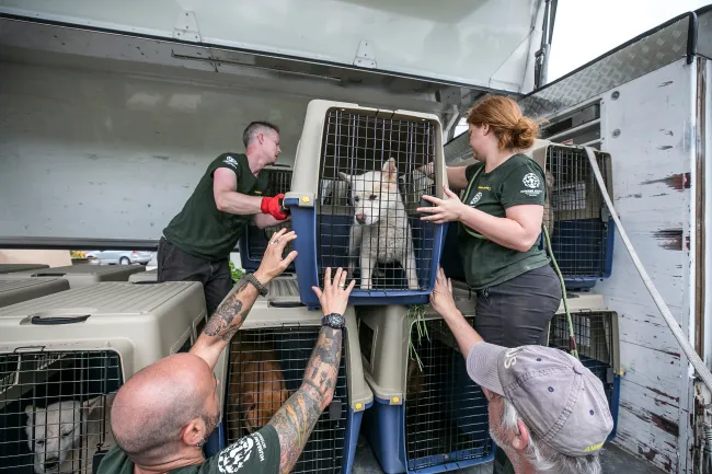 [/media-credit] The HSI Animal Rescue Team loads the rescued dogs onto a truck. The dogs will be flown to Canada to lead new lives filled with hope.[/caption]