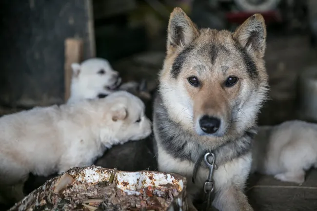 [/media-credit] Among the rescued dogs is Kaya, a sweet Jindo mix with beautiful little puppies she’s fiercely devoted to. When our rescuers approached Kaya, she immediately started wagging her tail and doing little, excited jumps to greet them.[/caption]