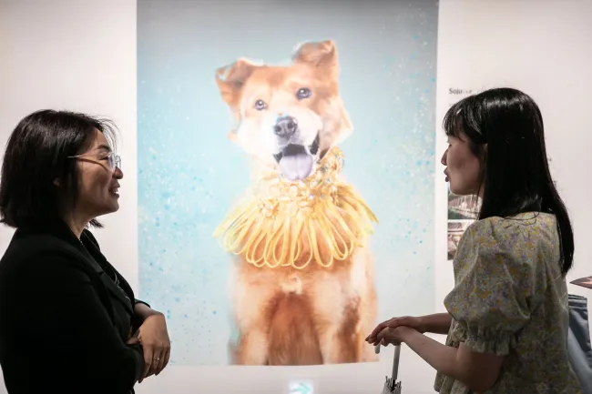 All of the dogs in the 17 portraits at the Seoul Metro Art Center were rescued from South Korea’s dog meat industry as part of our unique Models For Change program, which helps dog meat farmers transition out of the dog meat industry into alternative, humane livelihoods. Before taking these portraits, Gamand made personalized collars for by hand for her featured subjects to symbolize their journey from being just another body on a dog meat farm to becoming a loving and beloved member of their adoptive families.