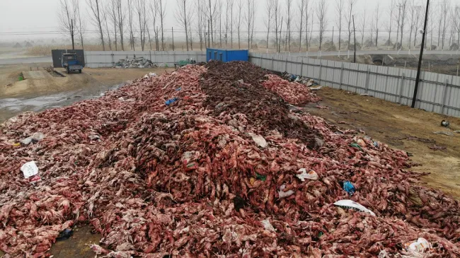 Skinned animals are heaped in a pile at a fur farm. Animals are sometimes skinned while still alive.