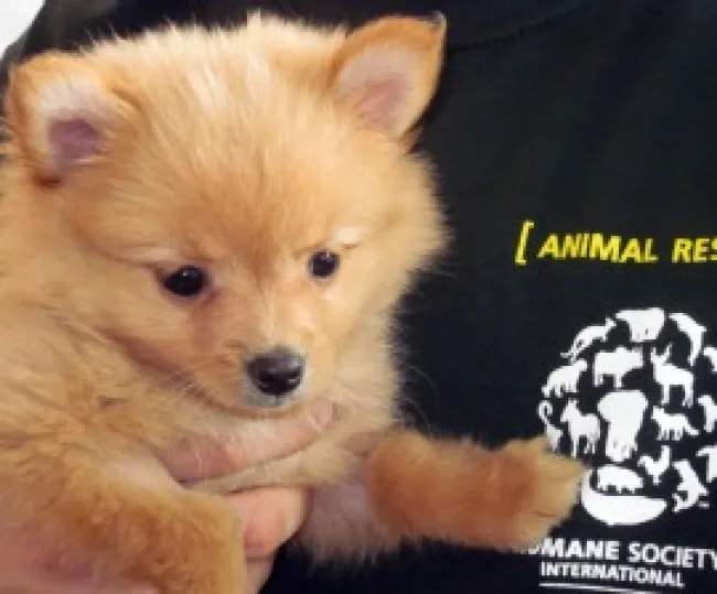 Of the more than 500 dogs HSI/Canada helped rescue from a commercial breeding facility in September 2011, one puppy in particular stole the hearts of both staff and volunteers. Named "Pocket" because she was so tiny she could almost fit into one, she found her forever home after a woman fell instantly in love with her during a chance meeting.
