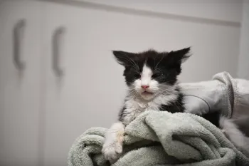 Another cat the responders found was Gizmo, whose family lost their cabin to the wildfires. Gizmo was one of two cats the family reported as missing. He had been gone for 21 days and they had little hope of finding him; Gizmo had been kicked by an elk as a kitten and was shy and aloof and more likely to hide than approach rescuers for help.