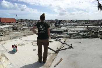 Later that same year, I stood on a cracked foundation of a small house, looking out over a sea of wreckage where a neighborhood once existed. Hurricane Dorian had brought extraordinary winds and relentless rain to the Bahamas, erasing entire communities from the island of Abaco. While we searched for animal survivors through mountains of debris and the muddy remnants of peoples’ lives, it seemed unfathomable that anyone could have survived.