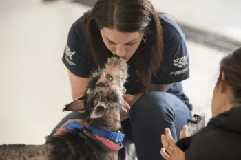 But as we often find during these rescues, the animals, despite the misery in which they lived, were eager to give and receive love. Our video team captured a happy and curious Emma guzzling treats and giving her new friend, HSUS Director of Animal Crimes Jessica Lauginiger, kisses a day after her rescue.
