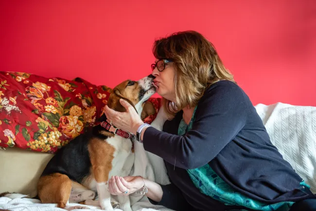 Those who have adopted former research dogs and cats can attest to the resilience and affection of these animals once they are given the chance to flourish in a home environment. Above, Teddy with Greta Guest, who adopted him in April.