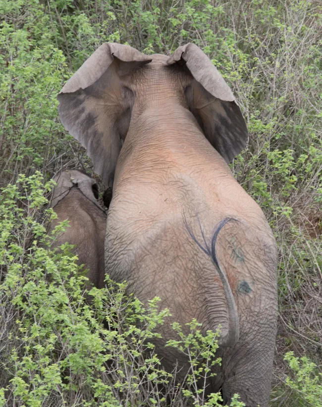 From the air, female elephants are darted with the immunocontraceptive vaccine, which contains a purple substance that temporarily marks their skin so that it’s easy to tell who has received the vaccine. The dart falls out almost immediately, which means there is no need to anesthetize or immobilize the elephants for treatment.