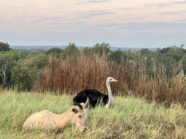 Since his rescue from a shuttered zoo in Puerto Rico, Reptar the ostrich has found a friend in a bighorn sheep named Lilly at Black Beauty Ranch. They are often seen relaxing side by side in their pasture.