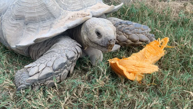 Pigs, including Jake, Peanut, Charlotte, Wilhelmina, Monet and Fred, in pig-like fashion, swiftly devoured the entire pumpkin, while, in tortoise-like fashion, Sulcata tortoises, Hans and Bugatti, took a bit more time to savor the sweet treat.