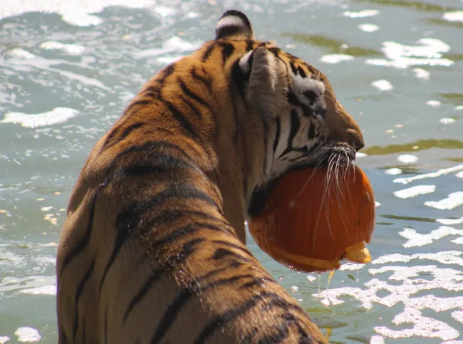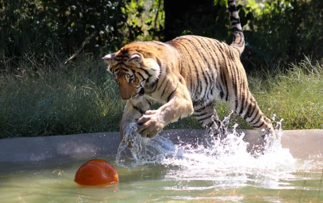 And, as recent photos clearly show, the rescued tigers at Black Beauty Ranch clearly love pumpkins. Given their Halloween treats, India, Elsa and Loki decided to chase, pounce on and even swim in their pools with their pumpkins.