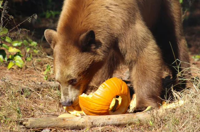 Two of Black Beauty’s bears, mother and son, Jackie and Russell, enjoyed playing with their pumpkins for a bit. Then they tore the pumpkins open and stuck their whole faces right inside. Eve, known as the former ‘bare bear,’ studied her pumpkin before deciding to proudly carry it around. Then she tore it open and ate it up.