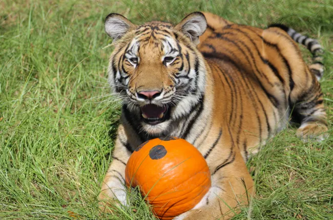 The rescued tigers at Black Beauty Ranch aren’t the only ones enjoying the autumn’s return. Black Beauty caregivers help this autumnal celebration along by spreading the pumpkins around the habitats of all the animals who would benefit from playing or munching on the big gourds, like monkeys, bears, tortoises and pigs, among others.