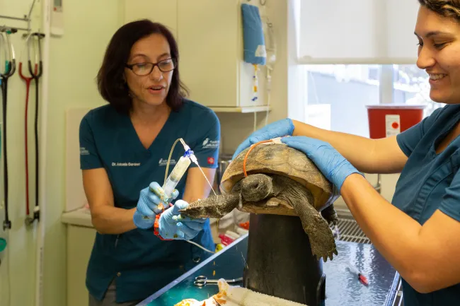 But this is not all they do. With so many experts on the staff, the wildlife center also functions as a teaching facility in wildlife veterinary medicine and rehabilitation. And because 90 percent of the animals seen here, like the pelicans, get here because of negative interactions with people, staff at the center work to educate the community about wildlife and peacefully coexisting with wild neighbors.