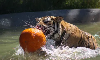 Rescued tigers at our animal sanctuary meet their first pumpkins