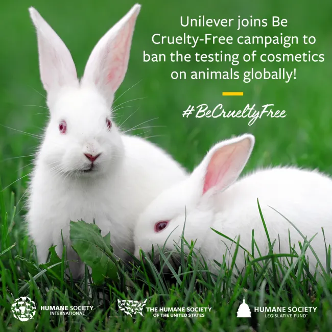 In a pathbreaking announcement that signals a certain end to the cruel practice of testing cosmetics on animals, the industry giant Unilever – maker of such popular brands as Dove, Degree and TRESemmé -- today announced it will support a global ban on such testing, in collaboration with Humane Society International, the Humane Society of the United States and the Humane Society Legislative Fund.