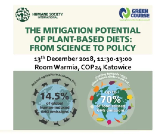 KATOWICE, Poland–At the United Nations’ global climate change conference, COP24, animal welfare charity Humane Society International and Israeli environmental organization Green Course held an official side event that brought together experts and policymakers to discuss pathways to incentivise plant-based diets and reduce reliance on meat, dairy and egg products from animals housed in intensive factory-farming environments. The Mitigation Potential of Plant-based Diets: From Science to Policy gave delegates a toolkit of policy recommendations and inspiration to see them implemented.
