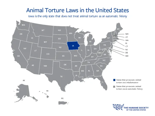 Iowans want their lawmakers to act to protect animal from such cruelty. In a Remington poll last December, 69 percent said they believe domestic animal torture should be a felony charge. Lawmakers in Congress and 49 states have already recognized that torturing animals is a serious crime, and should, in some circumstances, be dealt with as a felony.