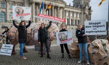 BERLIN—Mit einer Aktion vor dem Reichstag forderte die Tierschutzorganisation Humane Society International/Europe (HSI) ein gesetzliches Importverbot für Jagdtrophäen geschützter Arten. Anlässlich der heutigen konstituierenden Sitzung des neuen deutschen Bundestags trafen die frisch gewählten