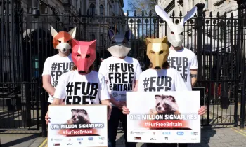 London—CEOs and Directors from five of the UK’s largest animal protection organisations gathered today with campaigners in geometric fox masks at the gates of No 10 Downing street to submit 1 million petition signatures to the Prime Minister, calling for the UK to ban the sale of cruel animal fur