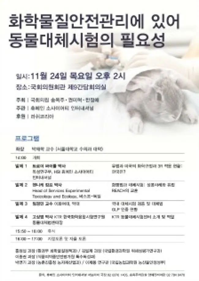 더불어민주당 송옥주의원, 권미혁의원, 한정애의원과 국제동물보호단체인 휴메인 소사이어티 인터내셔널(HSI)가 오는 24일 ‘화학물질 안전관리에 있어 동물대체시험의 필요성’을 다루는 토론회를 개최하며 동물대체시험법을 이용한 더 과학적이고 효과적인 접근의 안전한 화학물질관리에 대한 논의를 한다. 이번 토론회는 러쉬코리아 후원으로 이루어지며 한국동물실험대체법학회 및 국회동물복지포럼 자문위원을 맡고 있는 서울대학교 수의학과 박재학교수가 좌장을 맡는다.