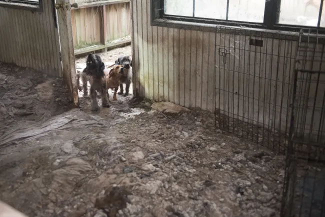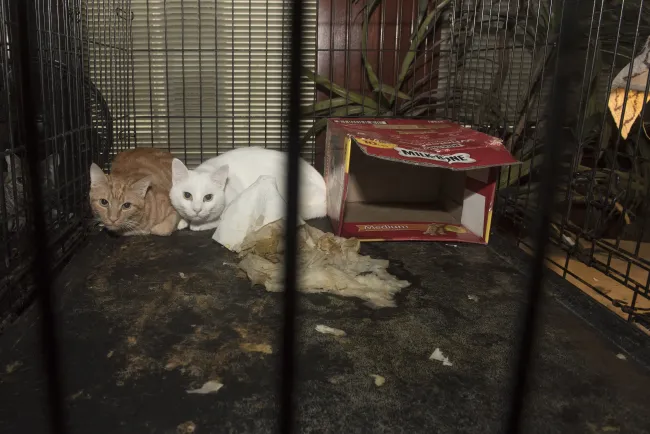 Locked inside crates were dozens of emaciated dogs and cats, including some who were sick. Many of the animals were covered in fleas and appeared to suffer from a lack of veterinary care. The place was filthy and disgusting.