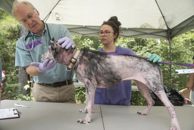 [/media-credit] Dr. Kirk Frazier from All Animals Veterinary Clinic examines one of the dogs rescued today.[/caption]