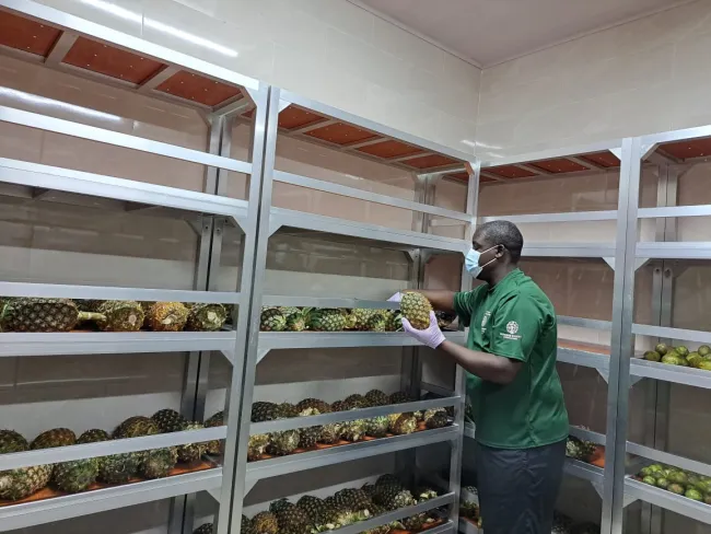The work of caring for the chimps starts before dawn each morning. At 6 am, our team of 10 caregivers, led by Dr. Love Kaona, prepares for the morning feeding by slicing up over 500 pounds of fresh fruits and vegetables for delivery to the chimps who live on six islands: Papayas, avocados, mangoes, pineapples, oranges and soursop with boiled rice or tubers, coconuts, palm nuts and peanuts. A dedicated team prepares birth control pills for all sexually mature female chimpanzees to ensure an efficient contraception program. The pills are crushed and mixed with fresh fruit and sometimes applied on bread with a spread of honey. The same process is used to administer medication as prescribed by the veterinarian.
